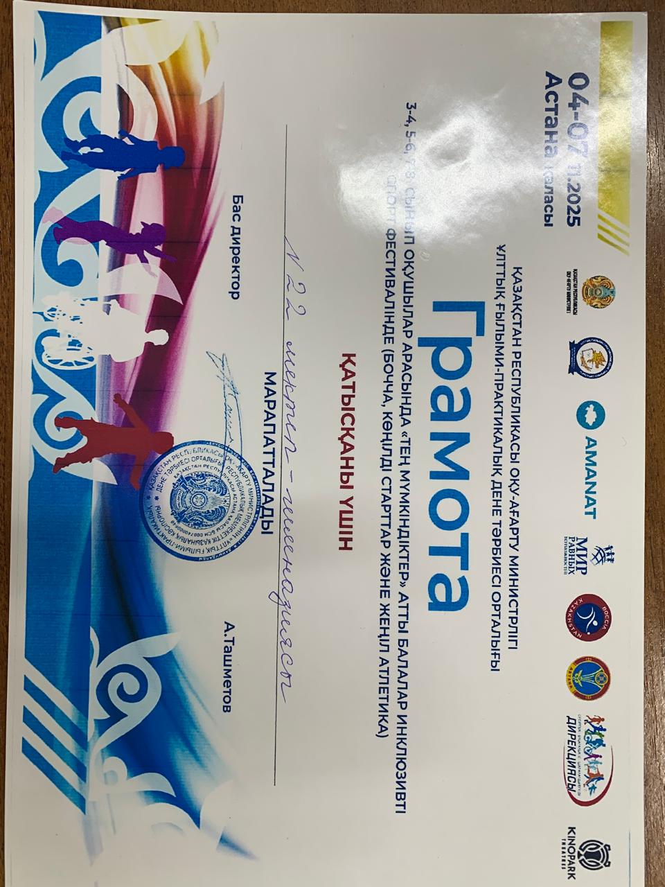 5-6 ноября 2025 года команда школы гимназии 22 приняла участие в чемпионате Республики Казахстан. Детский инклюзивный спортивный фестиваль: «Тең мүмкіндіктер - равные возможности» среди учащихся 3-4,5-6,7-8 классов. Наши ребята из 7-го класса состязались в виде «Веселые старты».